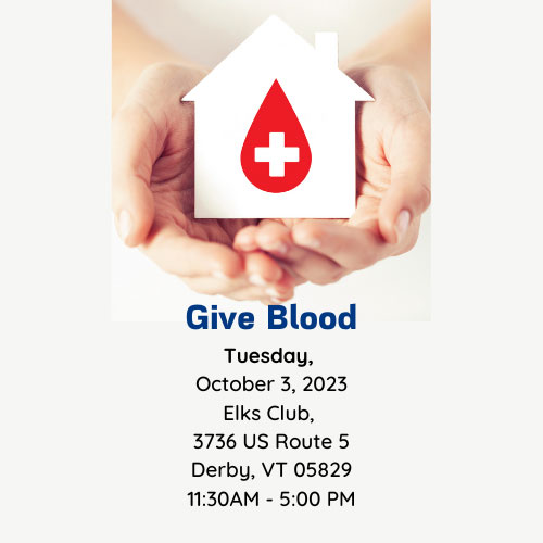 We are excited to sponsor the American Red Cross Blood Drive, October 3rd, 2023, at the Elks in Derby, located at 3736 US Route 5, Derby, Vermont. Make an appointment to give this precious, needed gift by visiting redcrossblood.org and click on Find a Drive. If you need help making an appointment, you can reach out to Kathleen Luce at kathleen.luce@redcross.org or 802-557-7474.